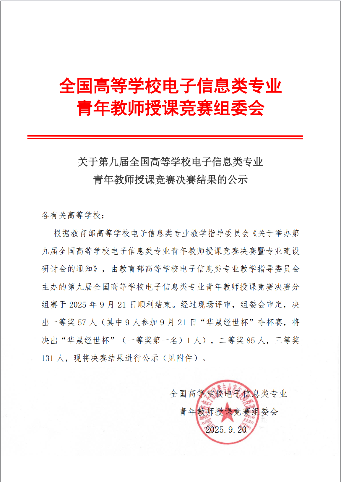 9月21日,第九届全国高等学校电子信息类专业青年教师授课竞赛决赛正式举行,来自众多高校的优秀教师同台竞技。经过现场严格评审,张思琦老师最终荣获全国二等奖。
